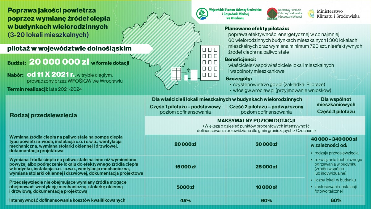 Zachęcamy do zapoznania się z programem "Poprawa jakości powietrza poprzez wymianę źródeł ciepła w budynkach wielorodzinnych - pilotaż na terenie województwa dolnośląskiego" skierowanym dla wspólnot mieszkaniowych i osób fizycznych.